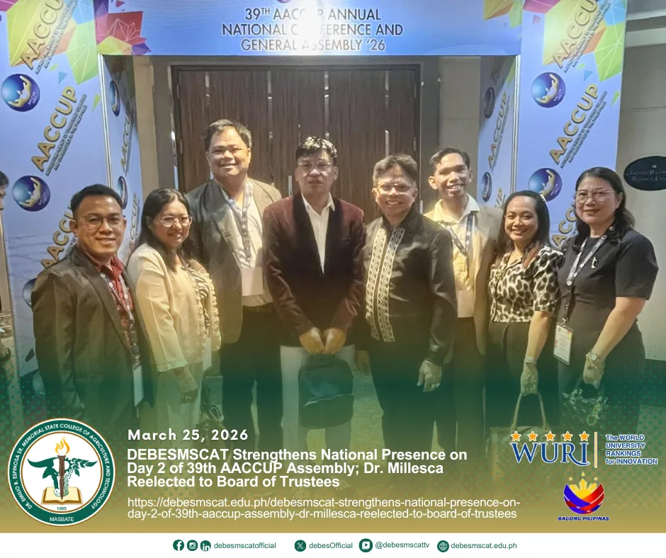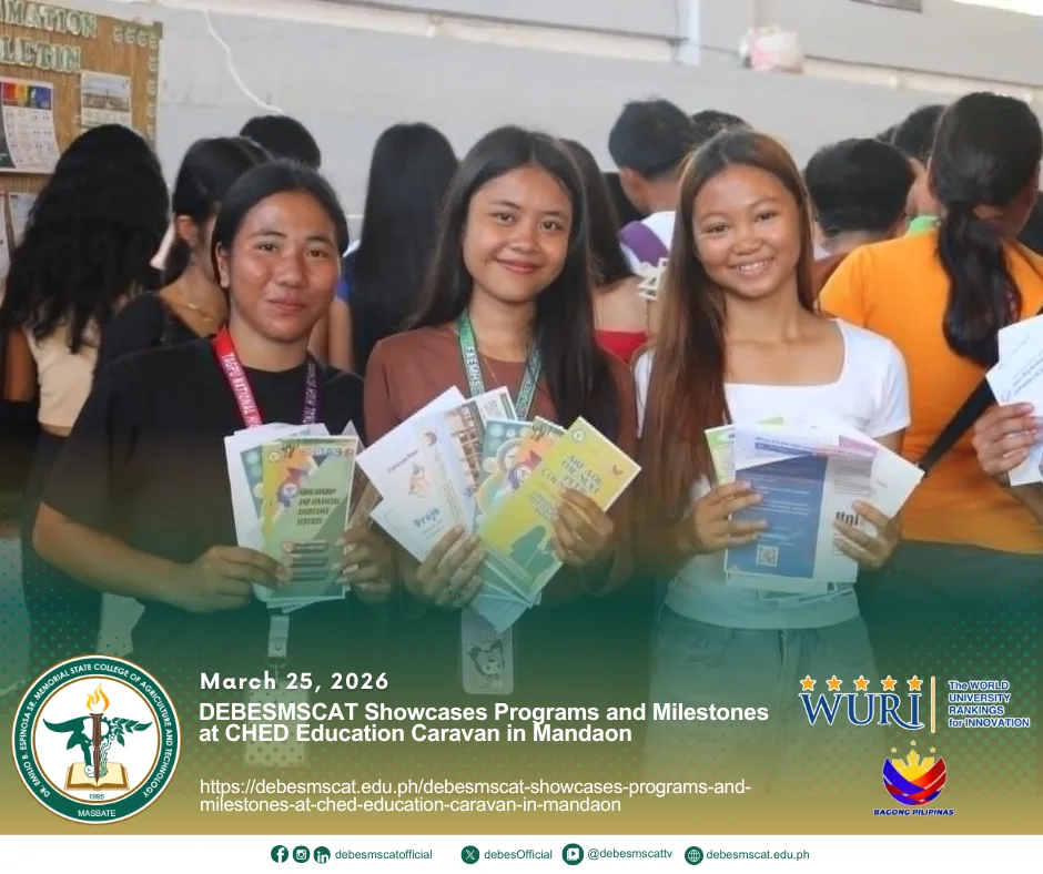 March 25, 2026- Dr. Emilio B. Espinosa, Sr. Memorial State College of Agriculture and Technology (DEBESMSCAT) actively participated in the Education Caravan spearheaded by the Commission on Higher Education (CHED) Regional Office V under Project PEPA (Patuloy na Edukasyon, Patuloy na Pag-Ahon), held at the Mandaon Covered Court. A key… Read more